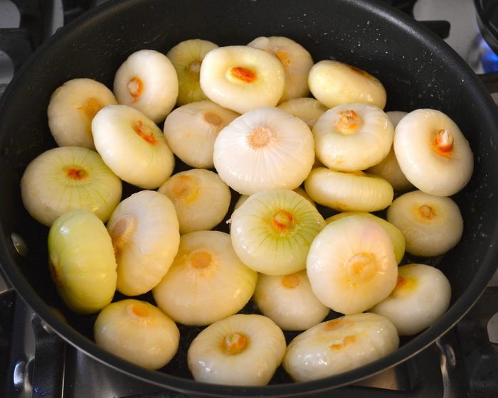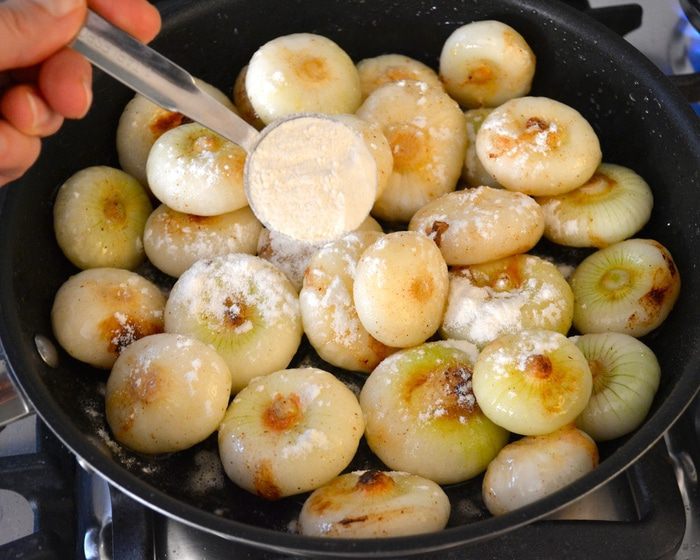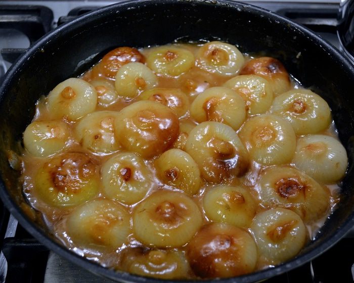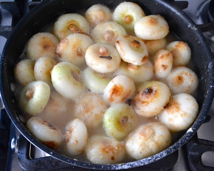 В этот момент добавить к луку бульон и гвоздику. Накрыть крышкой и готовить на слабом огне, пока луковички не станут мягкими и соус не уменьшится в объеме! Если потребуется, в процессе можно добавить еще немного бульона.