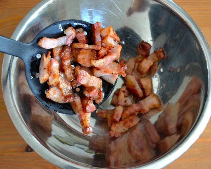 Готовое мясо выложить в миску с беконом.