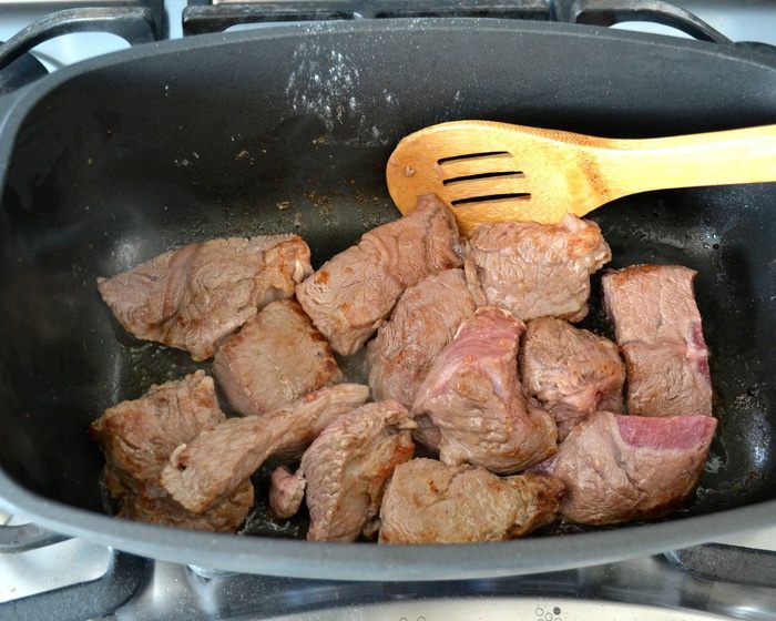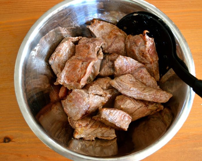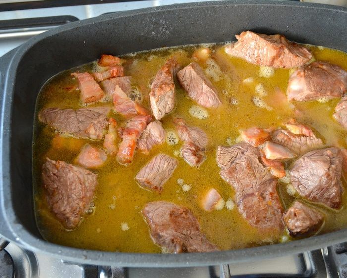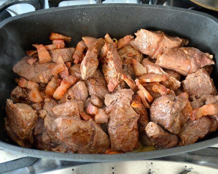 В той же кастрюле на оставшемся от бекона жиру обжарить частями мясо на достаточно сильно огне. У меня обычно получается обжарить в два захода. Не выкладывайте сразу все мясо! Кусочки должны хорошо поджариться со всех сторон.