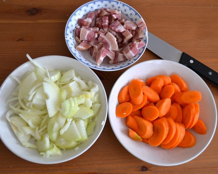 Бекон нарезать кубиками, лук и морковь очистить и нарезать не очень мелко.