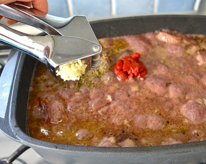Добавить лавровый лист, томатный концентрат и выдавить чеснок. Как следует осторожно все перемешать и все!:)