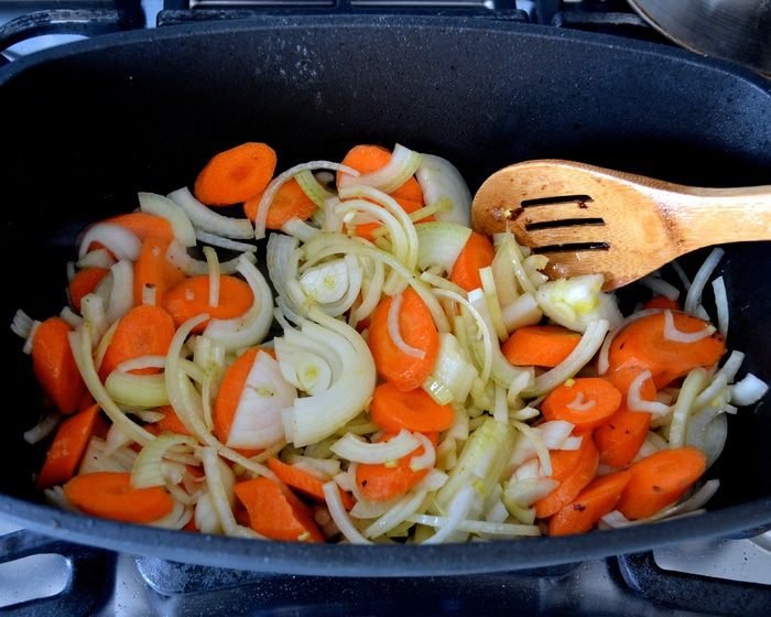 И теперь в кастрюлю выкладываем подготовленные овощи. Обжариваем несколько минут, время от времени помешивая.