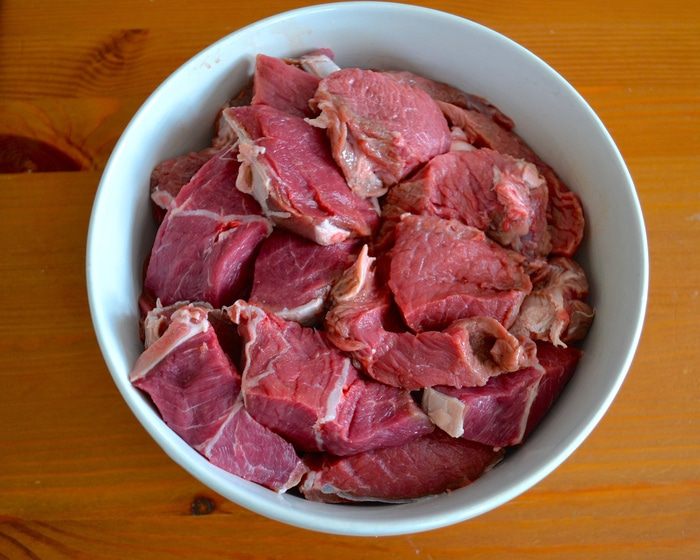 Мясо нарезать порционными кусочками, вымыть и как следует обсушить бумажным полотенцем (каждый кусочек).