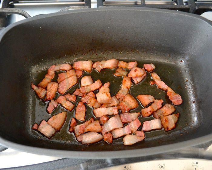 В глубокой кастрюле (казанке) с тяжелым дном, которую можно затем поставить в духовку, разогреть оливковое масло и обжарить сначала бекон до золотистого цвета.