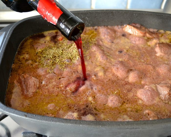 Влить красное вино (и пожалуйста, в этом блюде постарайтесь использовать доступное вам вино самого лучшего качества! Это важно.