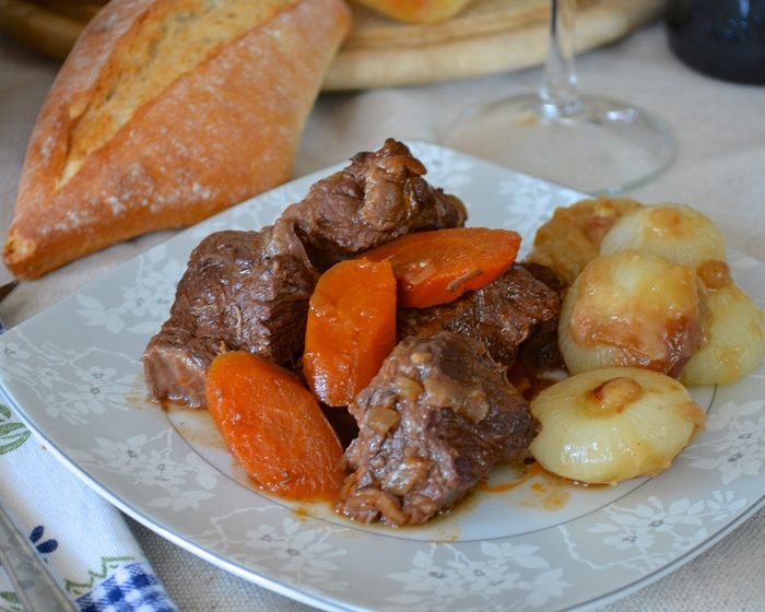 На сайте уже есть похожие рецепты Мяса по-бургундски... Потому что Бёф бургиньон (фр. bœuf bourguignon)это ни что иное как знакомая многим говядина по-бургундски. Бёф бургиньон является одним из тех крестьянских блюд французской кухни, которые со временем стали считаться полноправными представителями так называемой «высокой кухни». Скорее всего, потребность тушить говядину в винном соусе возникла в те времена, когда мясо было очень жёстким и простой жарки было недостаточно для его приготовления, а в хорошем вине не было недостатка....