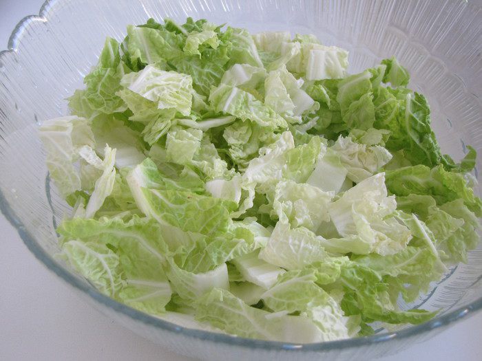 Пекинскую капусту нарезать не слишком мелко, избегать толстых стеблей. Выложить капусту в миску.