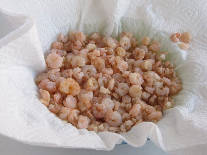 Креветки отварить в подсоленной воде примерно 1,5 минуты после закипания. Слить воду, остудить, обсушить на бумажном полотенце.