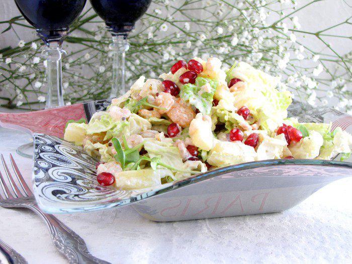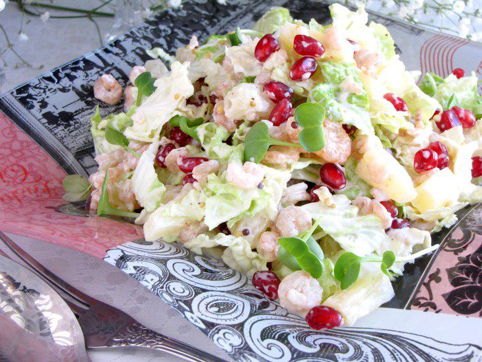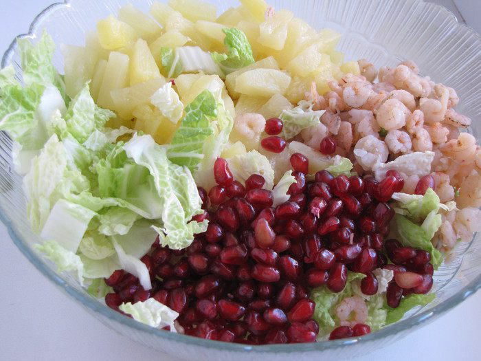 Добавить креветки, нарезанные кусочками ананасы и зерна граната.
