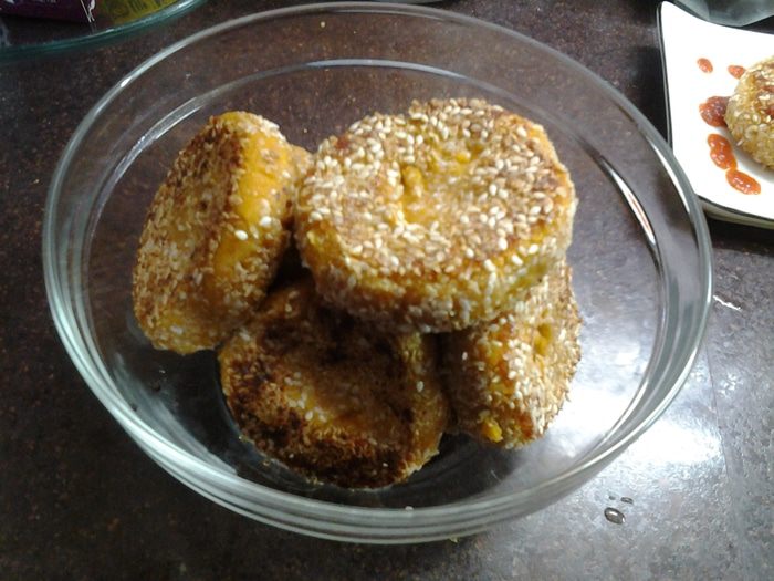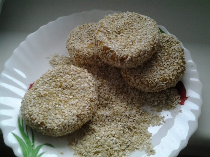 Для панировки смешать овсяные отруби и кунжут. Сформировать котлетки, обвалять в панировке.
