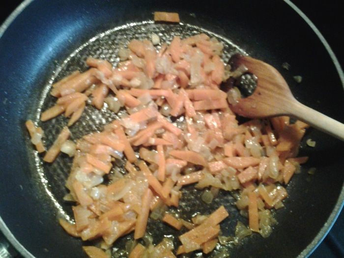 Лук мелко порезать, обжарить с 1-й ст.л. масла 2-3 минуты. Добавить порезанную соломкой морковь. Влить 4-5 ст.л. воды, тушить под закрытой крышкой, периодически помешивая, до готовности.