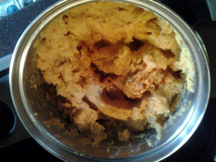 Соединить с остывшей чечевицей, пробить блендером. Без фанатизма, если останутся небольшие кусочки овощей, не страшно. Добавить паприку, пажитник и карри. Перемешать.