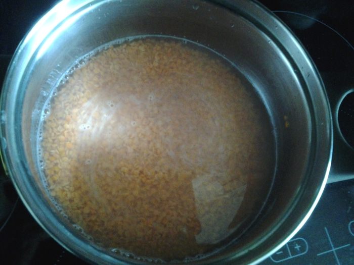 Чечевицу промыть, несколько раз меняя воду. Залить водой примерно на 2 см выше поверхности чечевицы. Оставить на 2 часа.