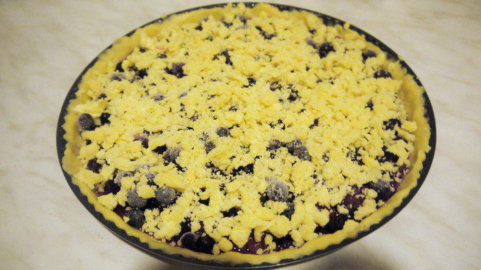 Раскатываем тесто, можно прямо в форме распределить тесто руками, обязательно сделать бортик. Намазываем тесто джемом. Сверху кладем ягоды. В этот раз у меня замороженная черная смородина. Если ягода кислая можно увеличить количество сахара в посыпке. Посыпаем крошкой и выпекаем в разогретой духовке 45-50 мин при t 180С.