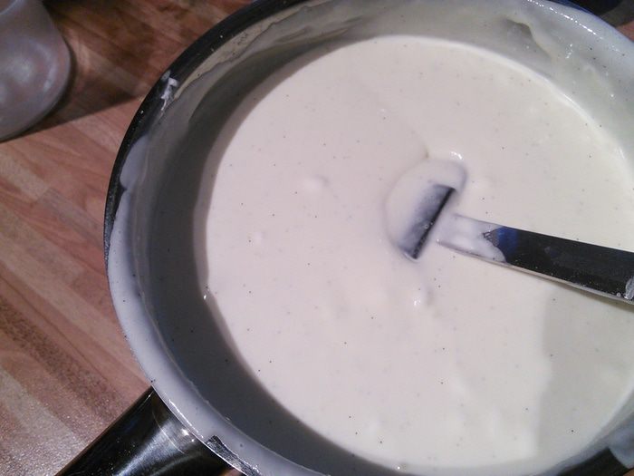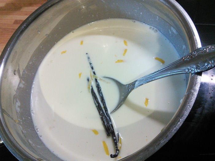 Для панна котты снять цедру с лимона, ванильный стручок разрезать вдоль на половину, в 400 мл сливок добавить сахар, цедру и ванильный стручок, довести до кипения. Снять с огня, дать 15 мин настояться. Процедить через сито. Из стручка достать семена и вернуть к сливкам. Заранее замоченный в холодной воде желатин отжать и растворить в сливках.