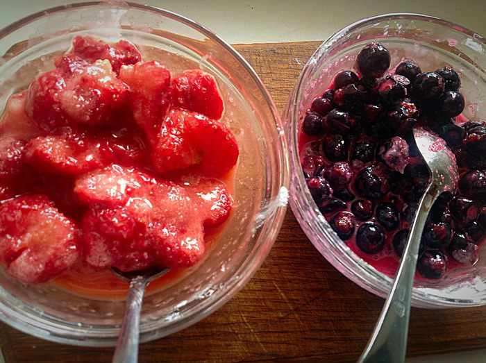 Ягоды разморозить. У меня черная смородина и клубника. Добавить к ним сахар и крахмал, перемешать.