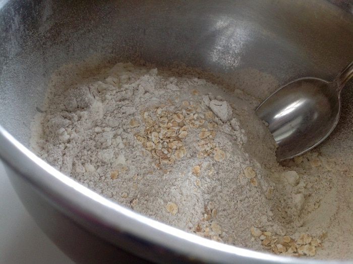 Два вида муки просеять и смешать вместе. Добавить овсяные хлопья, разрыхлитель, сахар и соль. Все хорошо перемешать.