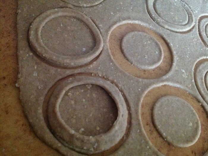 Тесто раскатать примерно 3-4 мм. Вырезать формой круги, а в половине кругов сделать середину меньшего диаметра - получатся ободки. Выложить вырезанные ободки на круг, и хорошо прижать края!