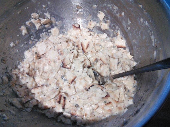 Мацу мелко покрошить руками, залить горячим молоком и дать минут 20 маце пропитаться и набухнуть. Маца должна полностью впитать молоко, если вам покажется, что молока мало, добавьте. Посолите, поперчите, добавьте зелень по вкусу, вмешайте яйцо.