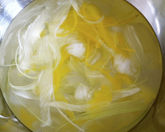 Вымыть и тонко нарезать стружкой фенхель, стебель сельдерея и 50 г болгарского перца. Погрузите эту овощную нарезку с миску с водой с кусочками льда.