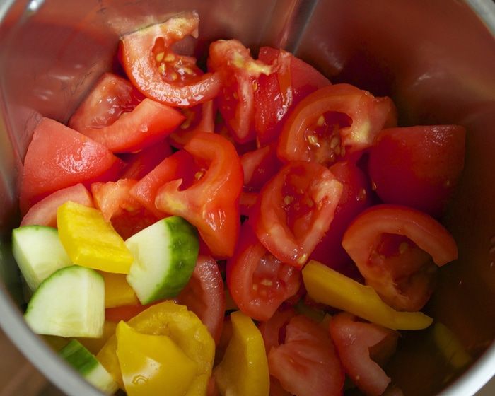 Помидоры ошпарить кипятком и очистить от кожуры и семян. Нарезать кубиками. Выложить в чашу блендера, добавить оставшийся сладкий перец и огурец. К овощам добавить оливковое масло, свежевыжатый сок апельсина. Включить блендер и измельчить овощи.