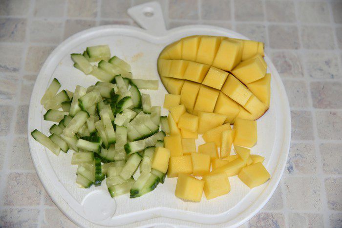 Огурец порезать небольшой соломкой. Манго почистить и нарезать кубиками.
