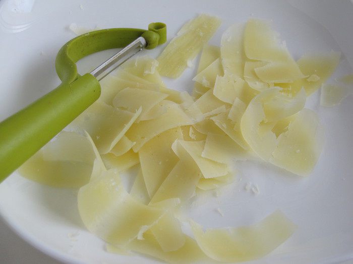 Нарезать сыр тонкой стружкой при помощи ножа для чистки овощей.