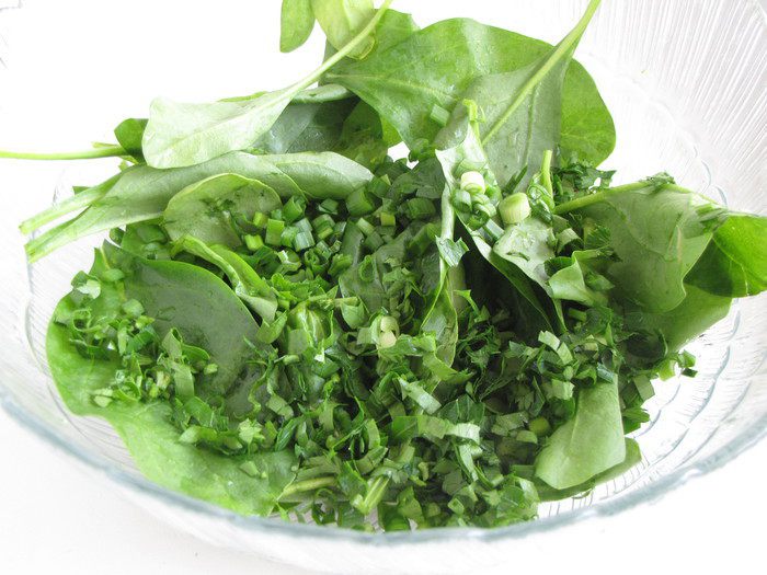 У нас сейчас напряженно с листовым салатом, и мне удалось купить только свежий шпинат. Но можно использовать любые салатные листья, например, очень хорошо подойдет рукола и корн.