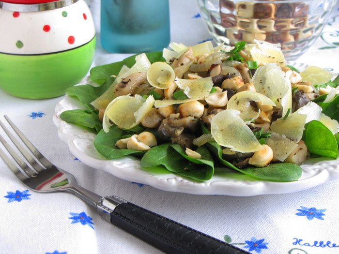 Интересное сочетание нежных вешенок, жареного фундука и пармезана с хрустящим зеленым салатом и легкой ноткой тимьяна.