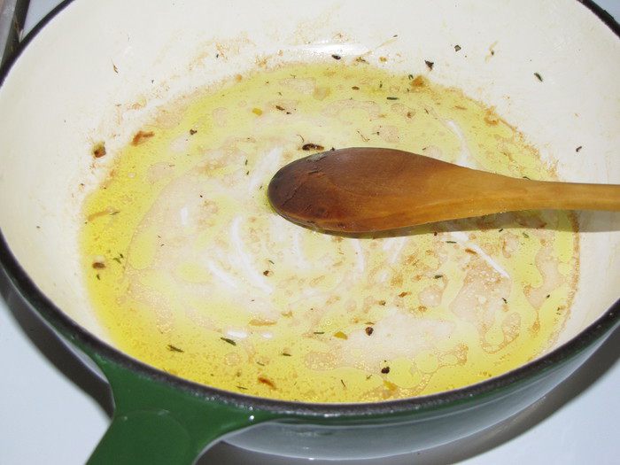 Нарезать грибы крупными кусочками и белый лук тонкими полукольцами. Разогреть в сковороде сливочное и оливковое масло, обжарить грибы вместе с луком. Добавить тимьян, соль и перец, пожарить еще немного. Переложить на тарелку и закрыть крышкой.