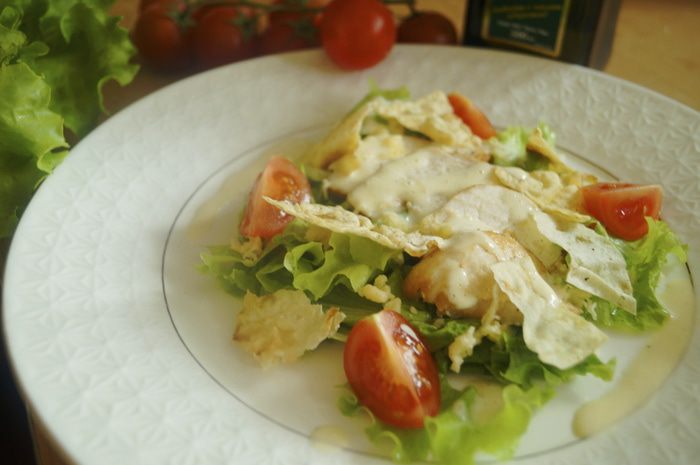 На тарелку, в которой будем подавать салат, выложить листья салата, порванные на крупные части. Затем поместить нарезанное куриное филе, посыпать тертым сыром, полить соусом и выложить помидорки. Чипсы из лаваша выложить на салат непосредственно перед подачей на самый верх, иначе они размокнут.