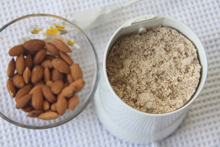 Добавить в тесто соль, разрыхлитель, соду, измельченный в муку миндаль.