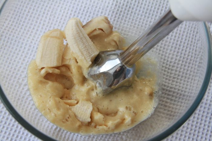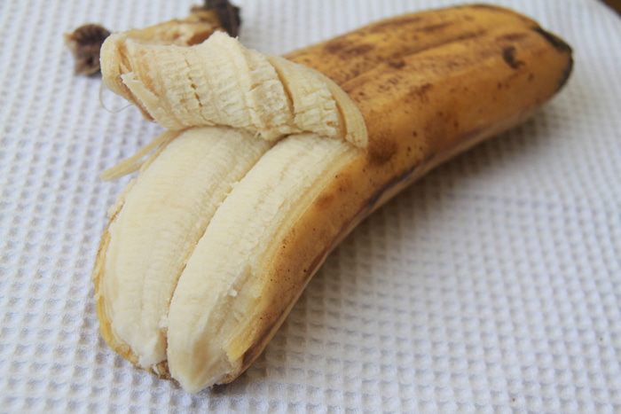Для пюре лучше взять переспевшие бананы. Вот такой необычный банан-сиамский близнец нам попался.