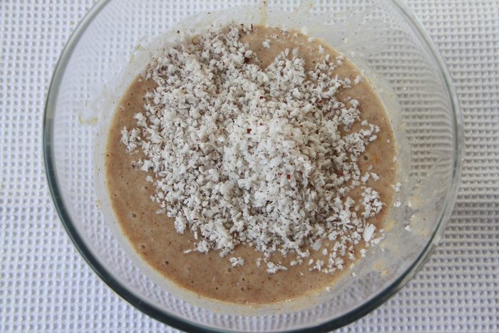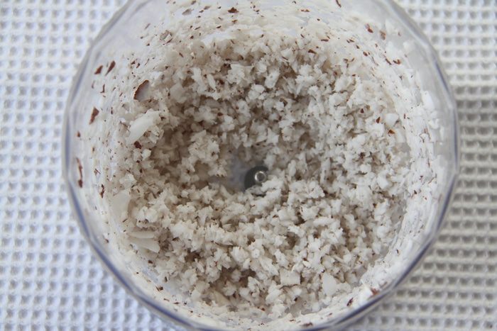 Мякоть половинки кокоса (100 г) измельчить блендером или на мясорубке.