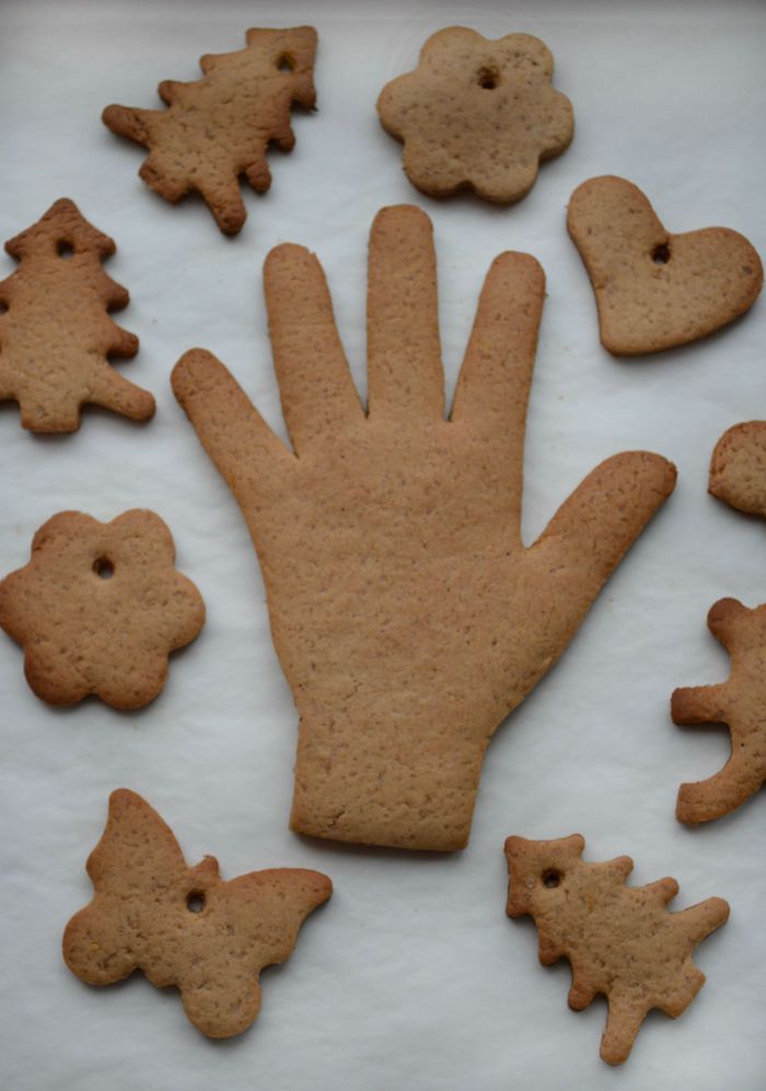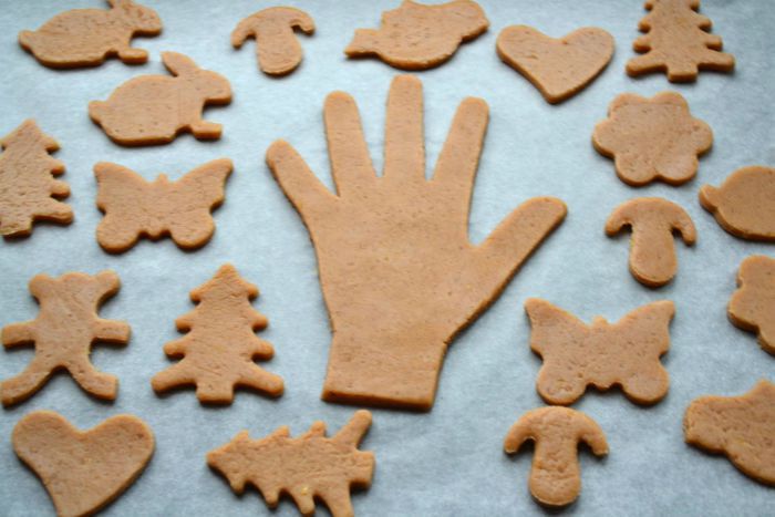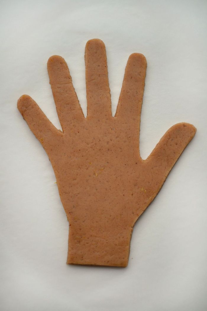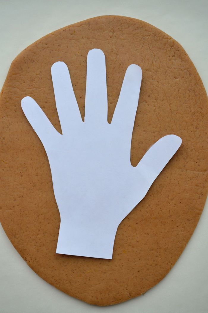 Отдохнувшее тесто раскатать скалкой до толщины примерно 0,7 см. Можно сделать бумажный шаблон своих рук, ручек детей - обвести руки на бумаге и вырезать.