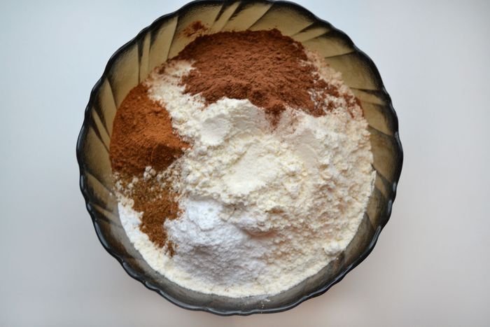 В отдельной емкости смешать муку (3 стакана, если не добавляете ром, коньяк), соль, соду, какао, корицу, мускатный орех, ваниль, гвоздику.