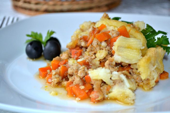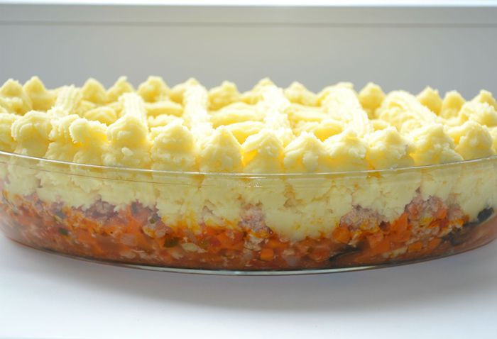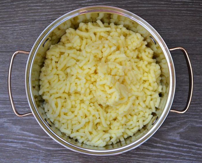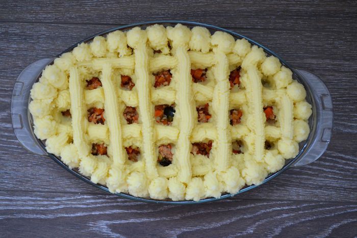 Картофель почистить, отварить, приготовить пюре, добавив 1 яйцо и сливочное масло и немного теплого молока. Хорошо взбить миксером. Т.к. пюре у меня было уже застывшее, я пропустила его через мясорубку. Нужно, чтобы в массе не было комочков, иначе они не пройдут через насадку кондитерского мешка.