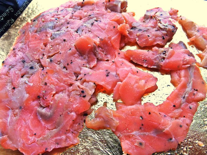 Сверху положить кусочки копчёного лосося.
