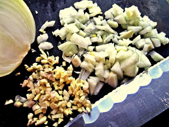 Лук, чеснок измельчить.