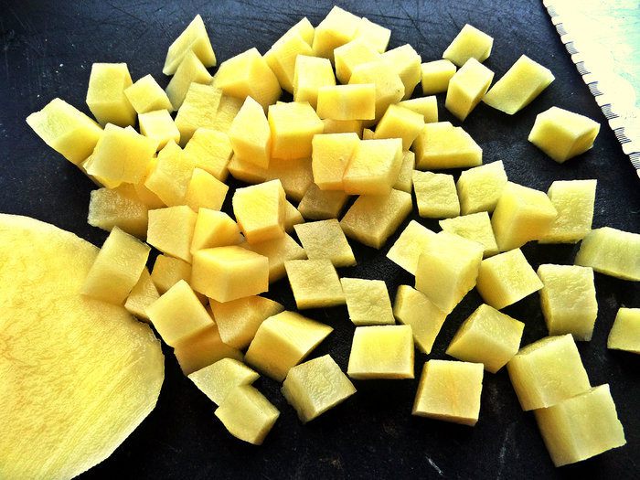 Картофель сырой нарезать на кубики.