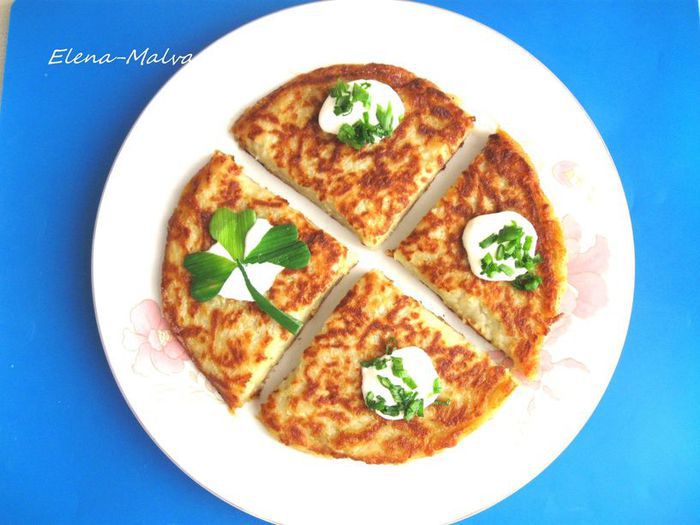 Боксти можно печь в форме оладушков или большого блина, который разрезается на четыре или восемь частей. Из приведенного количества ингредиентов получилось два больших толстых блинчика и 7 оладушков.