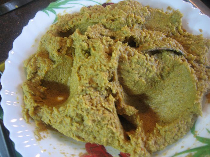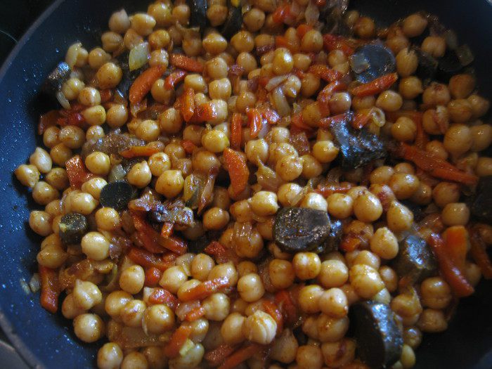 Добавить отварные грибы, специи, нут ( если нет готовых лесных грибов вполне подойдут шампиньоны). Влить в сковородку 5-6 ст. л. бульона в котором варился нут. Перемешать, выключить огонь и остудить до тёплого состояния.