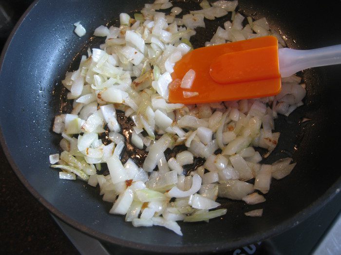 Лук обжарить на оливковом масле до прозрачности.