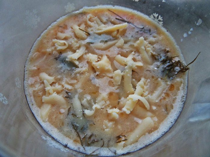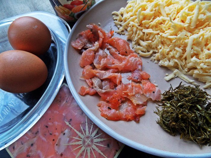 Сыр натираем, рыбку разбираем на кусочки (у меня в лимонном перце лосось). Укроп замороженный достала, хотелось сразу повторить!