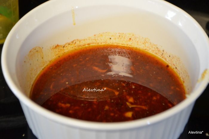 Смешать в пакете или в емкости все для маринада и раздавленный чеснок. Отложить ¼ ст. маринада.
