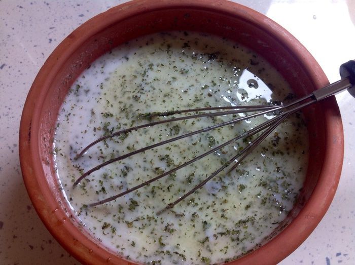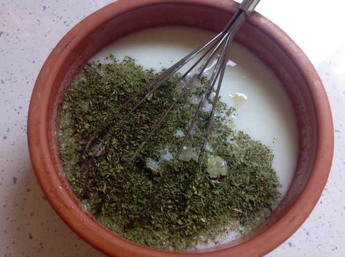 Добавить соль, сухую мяту, тимьян, черный перец и измельченный чеснок. Хорошо размешать.