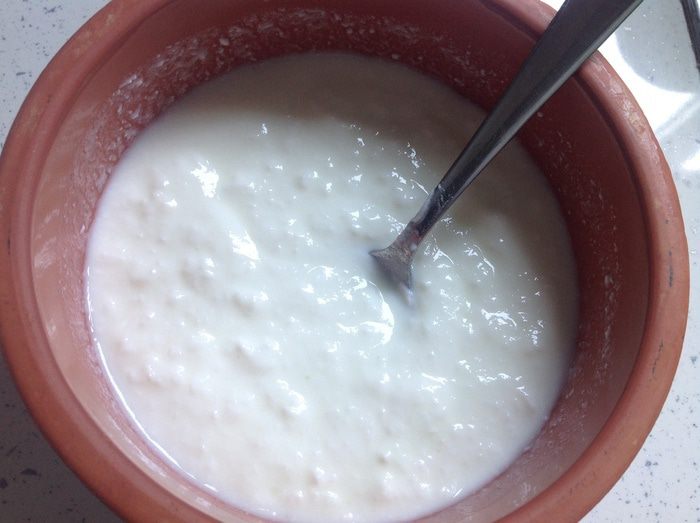 В глубокую посуду вылить йогурт и холодную питьевую воду. С помощью венчика хорошо перемешать до однородной массы (до густоты кефира). Возможно, воды понадобится больше или меньше, в зависимости от густоты и жирности вашего йогурта.