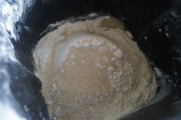 Если же ХП нет, то легко можно замесить тесто самим. Для этого в молоко льем масло. В другой чаше муку смешиваем с сахаром, солью, дрожжами. В молоко небольшими порциями вводим сухие ингредиенты и замешиваем тесто. Формируем его в шар и накрываем чистым сухим полотенцем, ставим в теплое место для подхода на 1,5 часа.