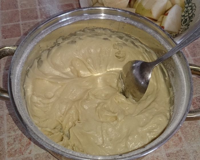 Яблоки моим немного очищаем от кожуры и сердцевины и режем тонкими дольками. В готовое тесто выкладываем яблоки и аккуратно перемешиваем, затем выкладываем в смазанную маслом форму. Ставим выпекать заранее подогретую духовку 180-200 градусов на 20 минут, пока пирог не подрумяниться.