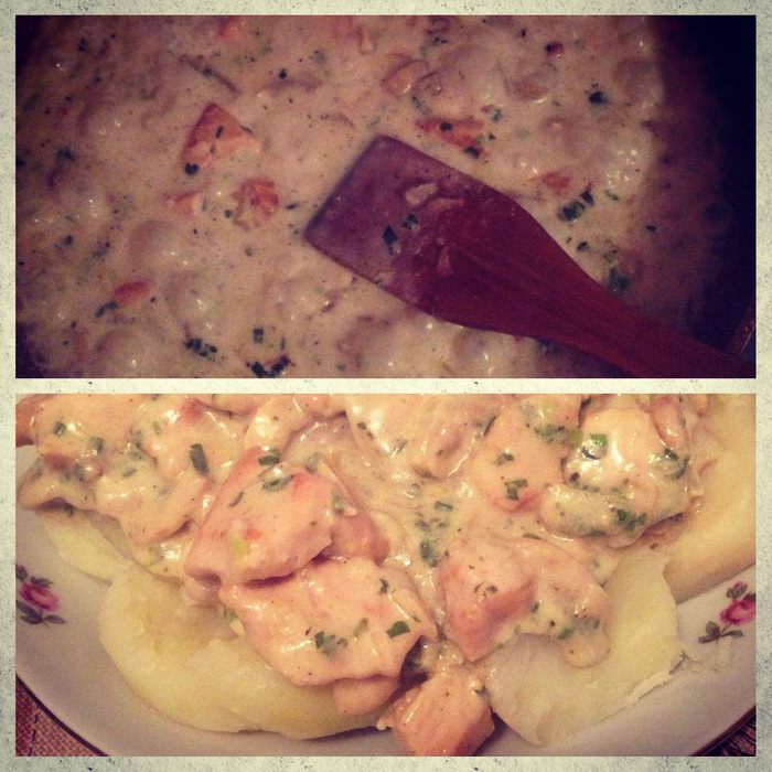 Выкладываем картофель в большую тарелку, сверху кладем курицу с грибами, посыпаем зеленью и наслаждаемся вкусным ужином:)